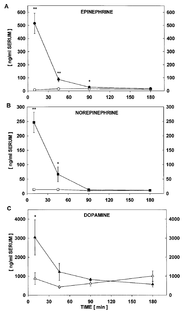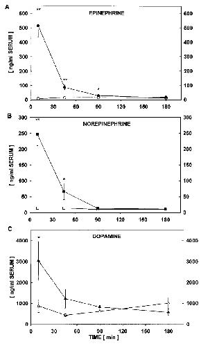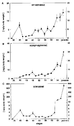 Changes in adrenal hormones during the complete developmental cycle from egg to juvenile were investigated in the amphibian Xenopus laevis. Whole-body concentrations of the adrenal steroids corticosterone (B), and aldosterone (Aldo) were determined by radioimmunoassay and those of the adrenal catecholamines epinephrine (E), norepinephrine (NE), and dopamine (D) were determined by HPLC. In addition, the catecholamine-synthesizing enzymes tyrosine hydroxylase, dopamine beta-hydroxylase, and phenylethanolamine N-methyltransferase were immunocytochemically localized for the characterization of chromaffin adrenal cells. B and Aldo were not detectable in the whole body before hatching. B levels rose earlier than Aldo levels from stage 36 onward. B had already peaked at stage 46, whereas the largest amounts of Aldo were found at stage 54. After peaking, both steroids decreased gradually to 2.7 +/- 0.62 (B) and 0.4 +/- 0.1 (Aldo) ng/g body wt (mean +/- SEM, n = 10) in juvenile animals. E, NE, and D were detected just after hatching, when E and D showed an early peak at stage 40. E and NE increased moderately during development and demonstrated a sharp increase at the end of metamorphosis from stages 62 onward to 14.4 +/- 1.7 (E) and 34.1 +/- 4.67 (NE) ng/g body wt (mean +/- SEM, n = 6). Interestingly, D levels had a distinct pattern, because concentrations of D remained lower than those of NE and E over nearly the complete development, but showed a dramatic rise during the latest stages, reaching 707 +/- 54 ng/g body wt in juveniles. This dramatic shift in catecholamine levels was confirmed by immunocytochemistry in parallel. A large increase in chromaffin cells labeled with tyrosine hydroxylase immunoreactivity occurred in the latest developmental stages. The catabolic rates for all catecholamines in vivo were similar, which indicates that the different levels are due to various rates of synthesis. Thus, adrenal corticosteroids as well as catecholamines may have regulatory effects during premetamorphosis and metamorphic climax.