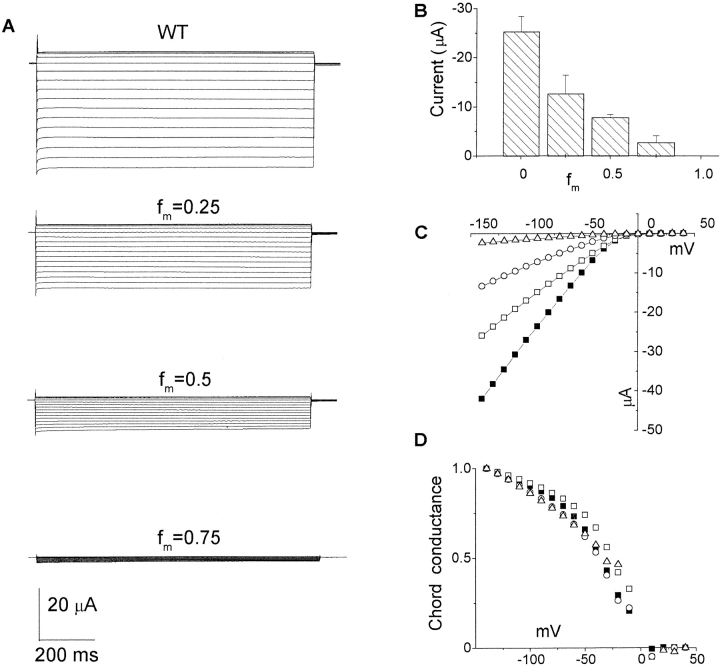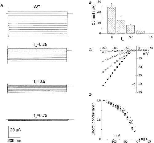 Figure 2. Macroscopic currents recorded from Xenopus oocytes injected with mRNA of the wild-type (WT), and mixture of WT and the R148H mutant at different ratios. (A) Representative current traces. Currents were recorded by applying steps of 1,000-ms duration from +40 to −140 mV in 10-mV decrements. Holding potential was −30 mV. (B) Current amplitude at −100 mV as a function of fractional R148H content in mRNA mixture. (C) Representative instantaneous I-V curves of the data in A. (D) The chord conductances normalized at −140 mV as a function of voltage. ▪, WT; □, fm = 0.25; ○, fm = 0.5; ▵, fm = 0.75.
