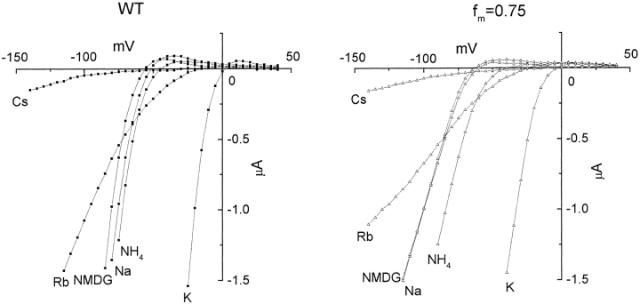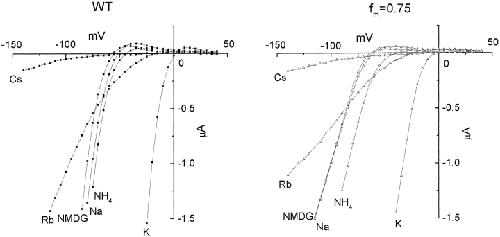 Figure 10. Cation selectivity of WT and R148H/WT hybrid channels. Current–voltage relationships for WT (left) and hybrid (fm = 0.75; right) channels were observed in the presence of 10 mM KCl and 80 mM XCl, where X was either K+, NMDG+, Na+, Rb+, NH4+, or Cs+. The holding potential was −30 mV and currents were evoked by steps from +40 to −140 mV in 5-mV increments.