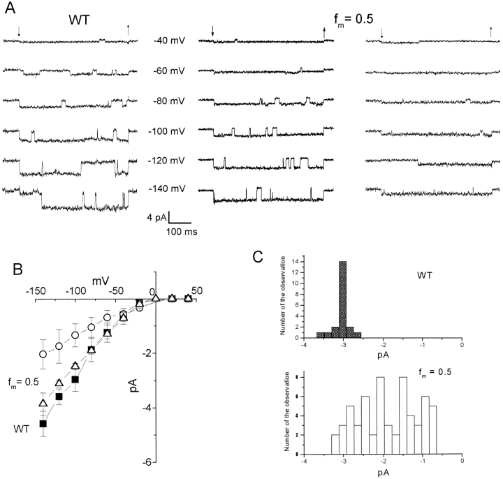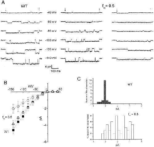 Figure 3. Single-channel currents of WT and R148H/WT (fm = 0.5) hybrid channels. (A) Representative single-channel currents recorded from Xenopus oocytes injected with mRNA of WT (left) and the mixture of WT and the R148H mutant (fm = 0.5; middle and right). Representative traces from channels of two different conductances are shown from coinjected oocytes. Downward and upward arrows indicate the beginning and the end of the voltage step (500 ms), respectively, from the holding potential of −30 mV. (B) Single-channel I-V curves for WT (▪) and hybrid (○ and ▵) channels. (C) Distribution of single-channel currents for WT (top) and coinjected R148H/WT (fm = 0.5) channels (bottom) at −100 mV obtained from different patches and oocytes (n = 21 and 60 for WT and hybrid channels, respectively).