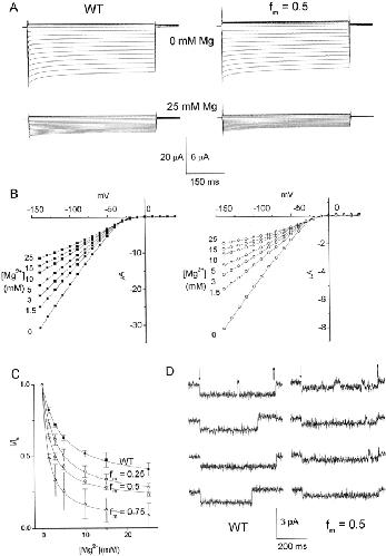 Figure 4. Sensitivity to external Mg2+ of WT and R148H/WT hybrid channels. (A) Representative traces of macroscopic currents recorded from Xenopus oocytes injected with WT (left) and a mixture of WT and R148H mutant mRNAs at fm = 0.5 (right). The scale bar indicates 20 μA for the left traces and 6 μA for the right. Pulse protocol was the same as that of Fig. 2 A while the duration was 500 ms. (B) Instantaneous I-V curves at different concentrations of Mg2+ for WT and hybrid channels (fm = 0.5). (C) Concentration dependency of the Mg2+ blockage of the fractional current at −140 mV. Curves represent fitting to Eq. 1 with Kd = 4.38 ± 0.19 mM (WT; ▪), 3.21 ± 0.19 mM (fm = 0.25; □), 1.92 ± 0.14 mM (fm = 0.5; ○), and 1.31 ± 0.06 mM (fm = 0.75; ▵). The unblocked fraction of currents was 0.31 ± 0.07 for WT, 0.20 ± 0.10 for fm = 0.25, 0.17 ± 0.01 for fm = 0.5, and 0.05 ± 0.01 for fm = 0.75. (D) Representative traces of single-channel currents for WT (left) and hybrid (fm = 0.5; right) channels recorded with patch pipettes filled with the bath solution containing 5 mM Mg2+. Downward and upward arrows indicate the beginning and the end of the voltage step, respectively, applied repetitively to −100 mV from a holding potential of −30 mV.
