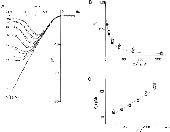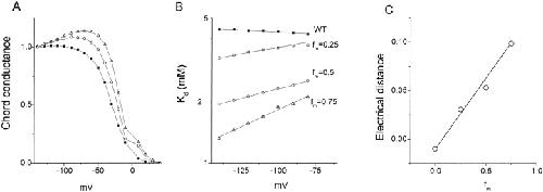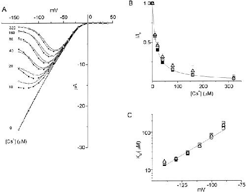 Figure 9. Cs+ blocking of WT and hybrid channels. (A) Representative I-V relationships for WT (•) and hybrid (fm = 0.5; ○) channels at different concentrations of Cs+. Currents for hybrid channels were scaled up to match the WT current at −100 mV in the absence of blocker. (B) Fractional currents at −140 mV as a function of Cs+ concentration. The curve represents fitting of the WT data to Eq. 1 with Kd = 13.7 ± 0.4 μM. 14.6 ± 0.26 μM for fm = 0.25, 15.03 ± 0.30 μM for fm = 0.5 and 17.24 ± 0.91 μM for fm = 0.75.(C) Voltage dependence of dissociation constants. A line represents fitting of WT data to Eq. 2 with Kd (0 mV) = 5.62 ± 0.75 mM and δ = 1.09 ± 0.03. Symbols are as in Fig. 2.