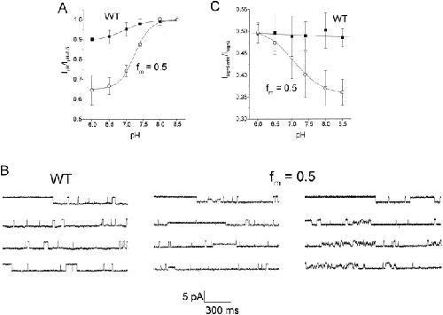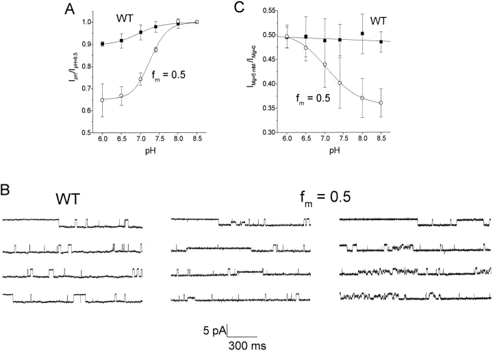 Figure 6. pH sensitivity conferred by the mutation, R148H. (A) pH dependency of the steady state current amplitude at â140 mV normalized to the control current (IpH/IpH = 8.5; âª). The line fitted to the hybrid channel data represents the titration curve of a single group with pK = 7.23 ± 0.03. [Mg2+]bath = 1 mM. (B) Steady state single-channel current traces, pH 7.06, recorded at â100 mV. The WT channel (30 pS) does not show sublevels. Long-lasting sublevels are shown for the 25 pS channel (middle) and flickering sublevels are shown for the 20 pS channel (right). Transition from the sublevel to the closed level was observed (for example, B, middle second trace). (C) The effect of pH on Mg2+ block of WT (âª) and hybrid (fm = 0.5; â) channels. The degree of current block by 5 mM Mg2+ is plotted as a function of pH. Here, Io is the current at â140 mV in Mg2+-free solution and I is the current in the presence of 5 mM Mg2+. The line fitted to the hybrid channel data represents the titration curve of a single group with a pK = 7.06 ± 0.03.