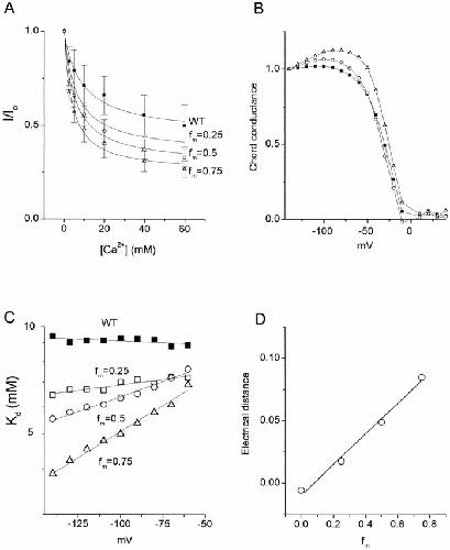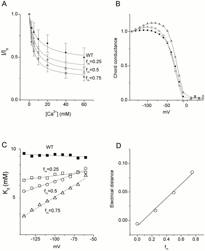 Figure 7. Ca2+ blockade of WT and hybrid channels coexpressed at different fm. (A) Dose–response relationships. Curves represent fitting to Eq. 1 with Kd = 9.4 ± 2.7 mM (WT; ▪), Kd = 6.4 ± 1.2 mM (fm = 0.25; □), Kd = 5.5 ± 1.0 mM (fm = 0.5; ○), and Kd = 3.9 ± 0.6 mM (fm = 0.75; ▵). (B) Chord conductances normalized at −140 mV as a function of voltage for WT and 60 mM Ca2+ (▪), fm = 0.5 and 60 mM Ca2+ (○), and fm = 0.75 and 60 mM Ca2+ (▵). Essentially similar results were obtained in three experiments. (C) Voltage dependency of dissociation constants for Ca2+ block of WT and hybrid channels. Symbols are the same as those in Fig. 2. Lines represent fitting to Eq. 2 with δ plotted in D. (D) Electrical distances for block by Ca2+ as a function of mutant content in mRNA mixtures.