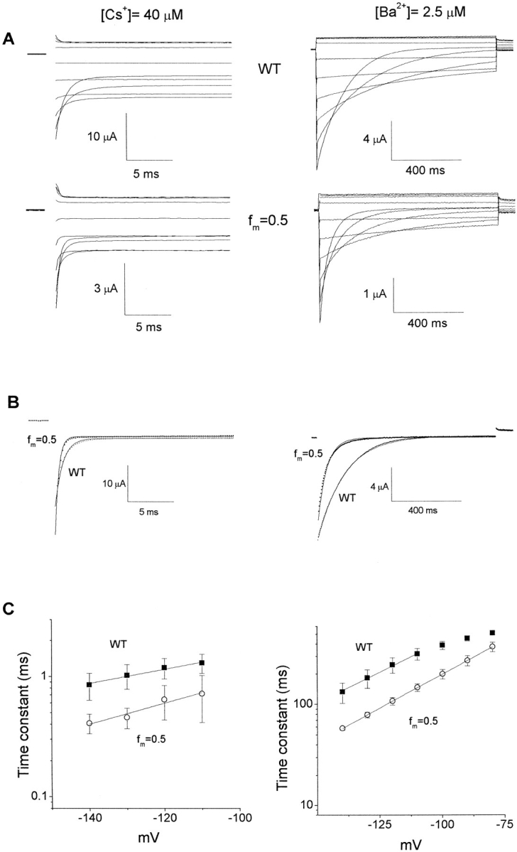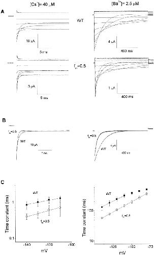 Figure 8. Blocking rate of Cs+ and Ba2+ in WT and R148H/WT hybrid channels. (A) Representative current traces showing the time course of Cs+ and Ba2+ block of WT (top) and hybrid ( fm = 0.5; bottom) channels. (B) Single-exponential fitting of blocking time course for Cs+ (left) and Ba2+ (right) at −140 mV. Dotted lines correspond to fitting with time constants of 0.82 and 0.37 ms for WT and fm = 0.5, respectively, for Cs+ block and 149 and 57 ms for Ba2+ block. (C) Voltage dependence of the time constant for Cs+ (left) and Ba2+ (right) blocking for WT (▪) and hybrid (fm = 0.5; ○) channels. Lines are fits to Eq. 3. For Cs+ block, k(0) = 164 ± 32 s−1, δ = 0.35 ± 0.04 for WT and k(0) = 166 ± 90 s−1, δ = 0.49 ± 0.11 for the hybrid. For Ba2+ block, k(0) = 0.13 ± 0.01 s−1, δ = 0.37 ± 0.01 for WT and k(0) = 0.22 ± 0.002 s−1, δ = 0.39 ± 0.001 for the hybrid. The ΔΔG‡ (=ΔG‡hybrid − ΔG‡WT) values were −0.02 RT for Cs+ block and −0.47 RT for Ba2+ block.