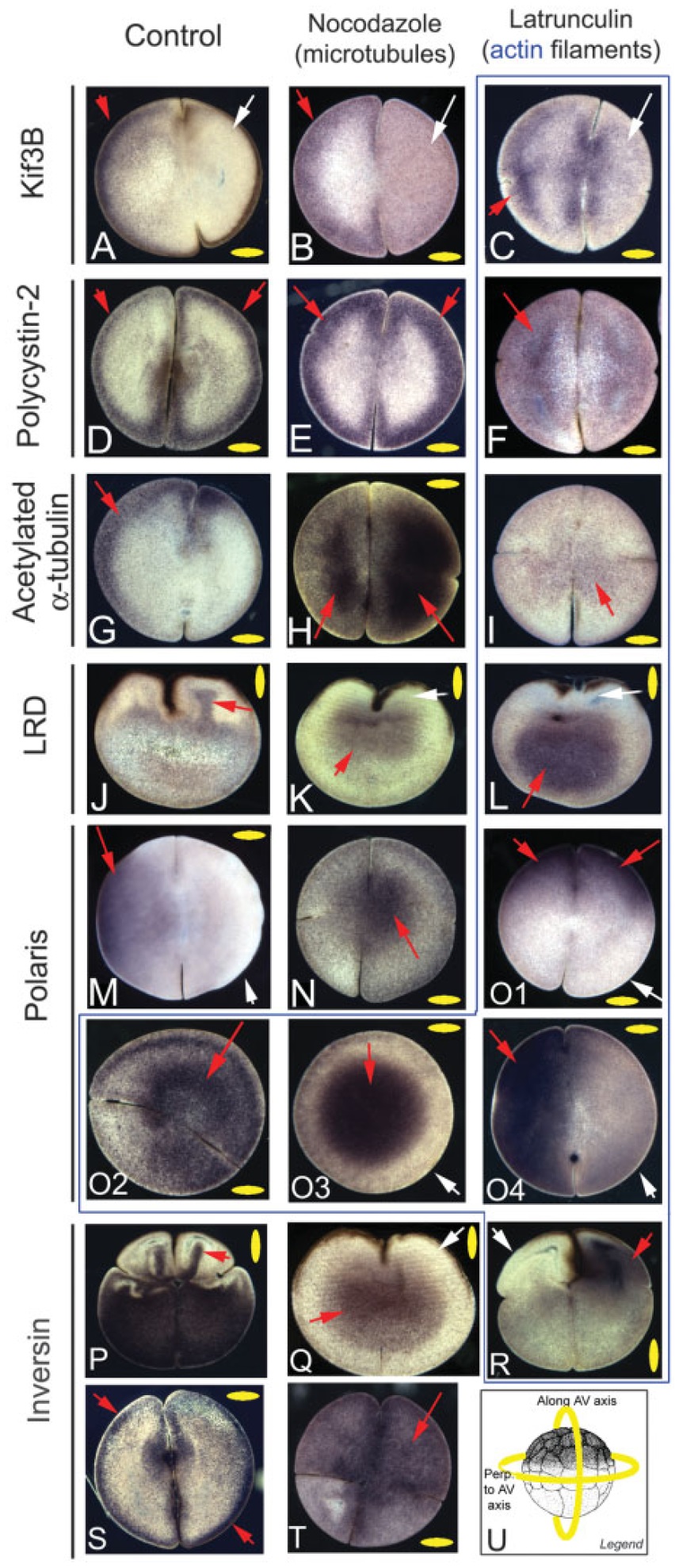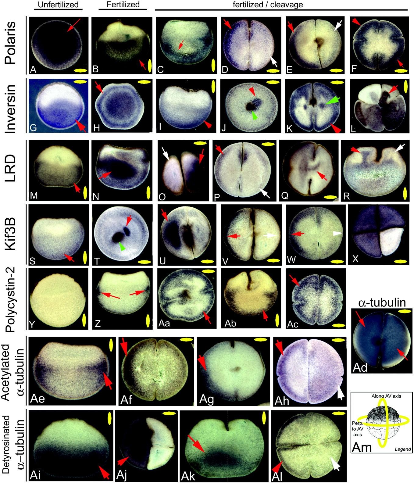 Figure 2. Localization of targets in unperturbed frog embryos. Polaris: (A) section taken perpendicular to the AV axis in the unfertilized Xenopus egg; (B) section taken parallel to the AV axis in an unfertilized egg; (C) section taken parallel to the AV axis in the fertilized egg; (D) in sections taken perpendicular to the AV axis in the 2-cell embryo, one of the two blastomeres shows strong stain near the cell membrane, although the other blastomere occasionally has some stain as well (E). In the 4-cell embryo, all four blastomeres exhibit cell membrane stain (F). Inversin: (G) section taken along the AV axis in the unfertilized egg; (H) section taken perpendicular to the AV axis in the unfertilized egg; (I) signal is seen in the vegetal cortex in fertilized eggs sectioned parallel to the AV axis, and can be detected in the microtubule organizing center (J; brown stain indicated by the green arrow is pigment brought in by the sperm entry trail); (K) section taken perpendicular to the AV axis at the 4-cell stage; (L) section taken along the AV axis at the 8-cell stage, animal pole is upwards. LRD: (M) section taken along the AV axis of the unfertilized egg; (N) section taken along the AV axis of a fertilized egg; (O) section perpendicular to the AV axis taken close to the animal pole reveals staining throughout one of the two blastomeres. P: sections taken through the equator perpendicular to the AV axis show asymmetric staining near the membrane cortex; (Q) some sections taken perpendicular to the AV axis revealed staining between the blastomeres before the completion of the cleavage furrow; (R) sections parallel to the AV axis reveal a rod of signal from the vegetal pole towards the animal pole, in one of the two blastomeres. KIF3B: (S) section along the AV axis of the unfertilized egg; (T) sectioning perpendicular to the AV axis of the fertilized egg reveals staining in the MTOC at nuclear fusion (brown stain is pigment brought in by the sperm entry trail, green arrowhead). Two-cell embryos sectioned perpendicular to the AV axis exhibit signal in the center (U) or in the membrane cortex (V,W) of one blastomere; (X) sections taken perpendicular to the AV axis at the four-cell stage reveal that staining is often absent from one of the four blastomeres on the right side. Polycystin-2: (Y) sections taken along the AV axis of the unfertilized egg show no signal; (Z) section of fertilized egg taken parallel the AV axis; (Aa) section taken perpendicular to the AV axis at the 2-cell stage; (Ab) section taken parallel to the AV axis at the 2-cell stage; (Ac) section taken across the AV axis at the 4-cell stage. alpha -tubulin: (Ad) antibodies recognizing all tubulin subunits stain throughout the cytoplasm of sections taken across the AV axis of the 2-cell embryo. Acetylated alpha -tubulin: (Ae) sections of fertilized and unfertilized eggs along the AV axis revealed spots of signal at the equator; (Af) sections of 2-cell embryos taken perpendicular to the AV axis revealed signal at the membrane cortex in one of two blastomeres; (Ag) section taken near the animal pole, across the AV axis of the 4-cell embryo. Ah: section taken near the vegetal pole, across the AV axis of the 4-cell embryo. Detyrosinated alpha -tubulin: (Ai) section of an unfertilized egg along the AV axis; (Aj) section taken across the AV axis of embryos at the 4-cell stage; (Ak) sections taken parallel to the AV axis at the 2 cell stage (dashed line indicates embryonic midline); (Al) section taken across the AV axis of a 4-cell embryo. Am: In each panel, yellow ovals with their long axis oriented left to right indicate that the section was taken across the AV axis; yellow ovals with their long axes oriented vertically indicate that the section was taken along the AV axis, with the animal pole being upward. Red arrows, signal; white arrows, lack of signal; green arrows, additional signal.