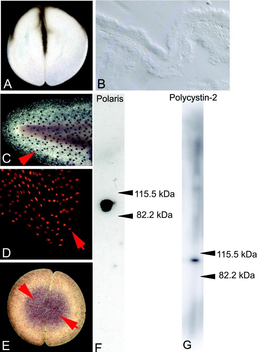 Figure 1. Controls and antibody characterization. Sections processed for immunohistochemistry with no primary antibody, no secondary antibody, or with primary antibody pre-incubated with target peptide show no alkaline phosphatase signal in frog embryos (A, sectioned along the AV axis) or chick embryos (B, sectioned across the primitive streak at st. 3). As predicted, the inversin, LRD, and acetylated and detyrosinated alpha -tubulin antibodies correctly label cilia in older embryos (tail epidermis shown with alkaline phosphatase detection (C) or fluorescent secondary antibody, D). Most primary antibodies, such as Kinesin5 (E) reveal symmetrical stain in early embryos. In Western blots, the Polaris antibody reacts with a single band of the predicted size of 95 kDa (F), while the Polycystin-2 antibody reacts with a single band of the predicted size of 110 kDa (G). Red arrows, signal; white arrows, lack of signal; green arrows, additional signal.