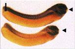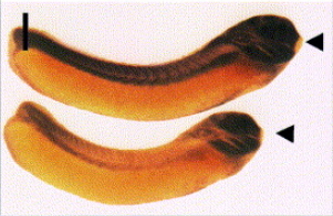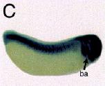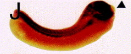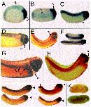 Fig. 2. Whole-mount in situ hybridization. Whole mount in situ hybridization with XlrpS1c was performed on Xenopus embryos at different developmental stages. (A) Neurula (stage 20), lateral view; (B) Early tailbud (stage 23) dorsal view; (C) Late tailbud (stage 27); (D, E) Hatching (stage 32), lateral view; (F) dorsal view of tailbud and hatching embryos; (G) Swimming tadpole (stage 35); (H) Swimming tadpole (stage 35 with double color in situ for XlrpS1c (red) and xJ1 (blue). (I, J) Whole mount in situ hybridization was performed on hatching stage (stage 32) embryos with ribosomal protein cDNA S22 (I), L1 (J, upper embryo) and L5 (J, lower embryo). (K) Negative control with sense XlrpS1c probe; early tailbud (stage 23) and late tailbud (stage 27), lateral views. so, somite; ov, optic vesicle; ba, branchial arches; cg, cement gland; ot, otic vesicle; he, heart; nm, nephrogenic mesoderm; hg, hatching gland. Arrowheads point to cement gland. Magnifications are as follows: A, B (30Ã); C, D, I, J (15Ã); E, F (10Ã); G, H (20Ã).