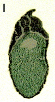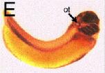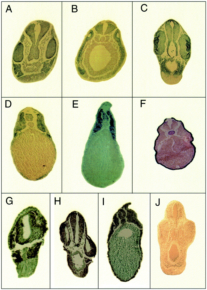 Fig. 3. Histological analysis of XlrpS1c expression. Following completion of the in situ hybridization procedure with an XlrpS1c probe (AâE), a cytokeratin probe (F) or an EF-1a probe (GâI), embryos were sectioned transversely at the level of the anterior neural tube/eye region (A, C, G, H), otic vesicles (B), mid-spinal cord (D, F), or tailbud (E, I) and the resulting sections photographed with bright-field optics. Stages of embryos were as follows: A, B, G, H, late tailbud (stage 25â27); C, D, E, F, I, hatching (stages 32â34). J depicts an anterior (optic level) section through a hatching stage (stage 32) embryo which was hybridized with a the sense XlrpS1c probe as a negative control. Nt, neural tube; ov, optic vesicle, ep, epidermis, ot, otic vesicle, ba, branchial arches; le, lens; ey, eye; cg, cement gland; no, notochord, so, somite. Magnifications are as follows: A, B, C, H (50Ã); D, G, I (60Ã); E (70Ã); F (40Ã).