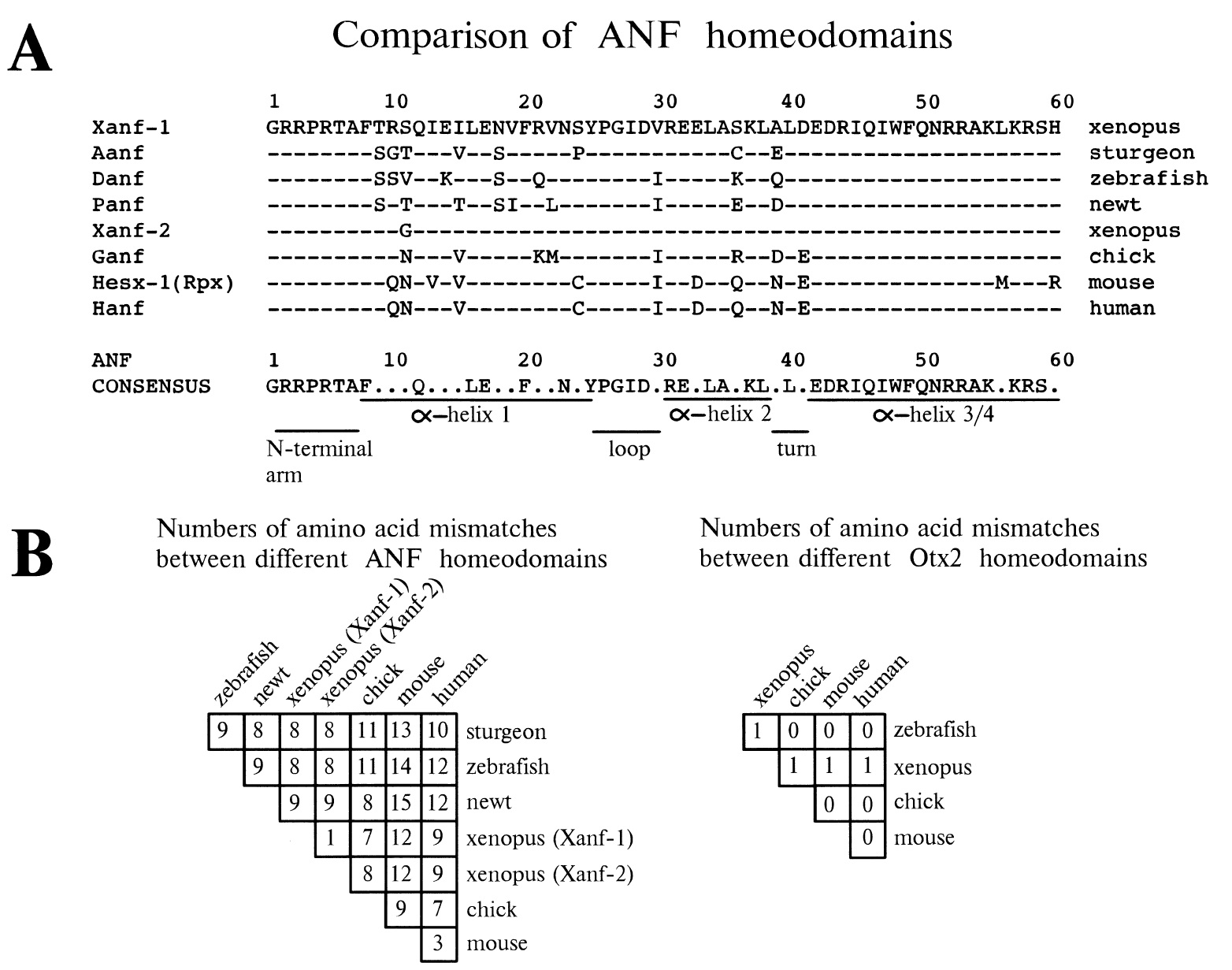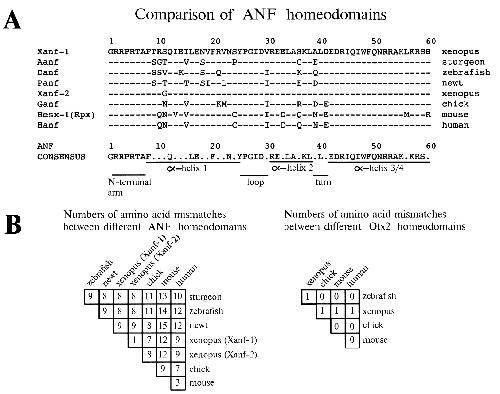 Fig. 1. (A) Comparison of amino acid sequences of known Anf homeodomains. All sequences are compared to the amino acid sequence of the