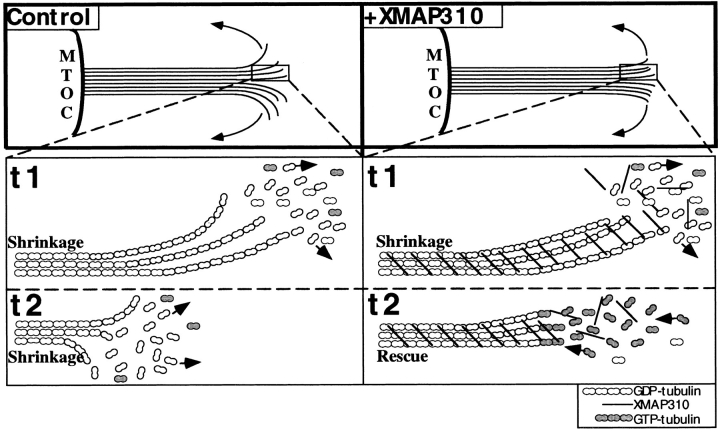 Figure 6. Model for how XMAP310 may promote rescues and MT cross-linking. (Top) Plane-projection of a depolymerizing (shrinking) MT in the absence (Control) or presence of XMAP310 (+XMAP310), with protofilaments (lines) peeling off the MT by out-wards curvature (arrows). Note the more blunt MT end in the presence of XMAP310 which could be promoted if cross-linking of protofilaments by XMAP310 prevents the outwards curvature of protofilaments. (Bottom) Magnifications of the boxed areas, showing part of the MTs at two different time points, t1 and t2. In the Control, the MT is shrinking both at t1 and t2, by loss of GDP-tubulin (arrows). In the presence of XMAP310 the MT is shrinking at t1. At t2 the MT has been rescued. A depolymerizing MT (t1) will meet resistance towards depolymerization due to the cross-linking of protofilaments/MTs, but XMAP310 does not dramatically prevent the loss of the tubulin dimers from the depolymerizing ends (little effect on vs). Eventually depolymerization of the MT is blocked long enough to maintain the depolymerizing MT-GDP-lattice in a straight conformation allowing new GTP-tubulin subunits to be added to the end, and the MT has been rescued (arrows indicate the direction of the flux of tubulin subunits).
