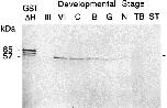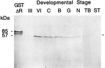Immunoblot of proteins extracted from oocyte stages III and VI (mid- and late-oogenesis) and the same embryo stages as described in Fig. 2. Total protein minus pigment and yolk, equivalent to two oocytes or embryos, was separated by SDS-PAGE and transferred to nitrocellulose membranes (Schleicher and Schuell). Blots were incubated for 2 h at 20°C with anti-δV (1:2000) then with peroxidase-conjugated anti-rabbit IgG (1:2000, Chemicon) and developed with 3,3â²-diaminobenzidine/H2O2. Reaction with the GST-δR fusion protein is also shown.
