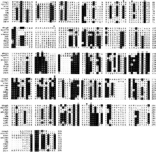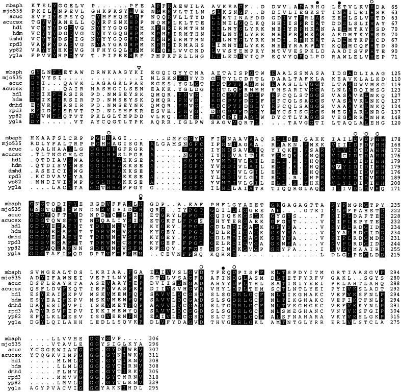 Multiple sequence alignment of HDm with related proteins, identified using the BLITZ algorithm. Accession numbers and references: Xenopus laevis HDm (X78454); human HD1 (U50079, Taunton et al., 1996); Drosophila melanogaster HD/Rpd3 (Y09258, De Rubertis et al., 1996) Caenorhabditis elegans hypothetical protein Yp82 (Q09440, Waterston et al., 1992); Saccharomyces cerevisiae Rpd3 (P32561, Vidal and Gaber, 1991); Bacillus subtilis acuC (L17309, Grundy et al., 1993); Staphylococcus xylosus acuC (X95439); Agmenellum quadruplicatum hypothetical protein Ygla (P28606, Wagner et al., 1993); Mycoplasma bullata Aph (D10463, residues 84–104 omitted for formating, Sakurada et al., 1996) Methanococcus jannaschii 0535 (U67502). Positions identical in six or more of the ten proteins are boxed black. The alignment was obtained using the PILEUP algorithm. Residues of MbAph suggested to be involved in zinc co-ordination ( Sakurada et al., 1996) are indicated (closed circles) as are Asp and His residues conserved within all ten proteins (open circles).