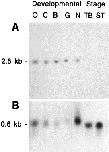 Expression of HDm during early development at the level of RNA. (A) Autoradiograph of Northern blot of total RNA from oocytes (O, stage VI); and from embryos at: cleavage (C, stage 4); blastula (B, stage 8); gastrula (G, stage 12); neurula (N, stage 16); tail-bud (TB, stage 26); swimming tadpole (ST, stage 40). Transfers were hybridized with the riboprobe described in Fig. 1. (B) As in (A) but hybridized with an antisense riboprobe covering the length (476 nucleotides) of the cDNA encoding the X. laevis ribosomal protein L22 (EMBL data bank accession number: X94243). Total RNA equivalent to three oocytes or embryos was separated on denaturing formaldehyde/formamide gels transferred to nylon membranes (Zeta-Probe, Bio-Rad) and hybridized for 18 h with the HDm and L22 riboprobes labelled to similar specific activity (approx. 2 mCi/mg). After washing to high stringency (0.1ÃSSC at 65°C), blots were exposed for 18 h in contact with X-ray film (Agfa).