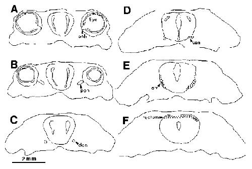 more caudal levels, from the eyes to the optic tecta. onhoptic