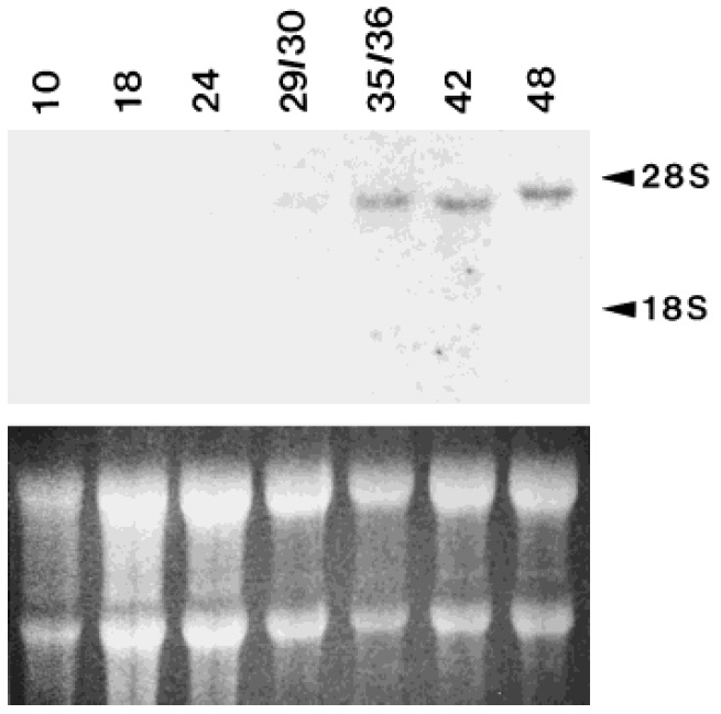 RNAs. (Lower) The same gel stained with ethidium bromide prior to transfer to nitrocellulose, indicating relative