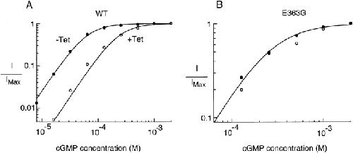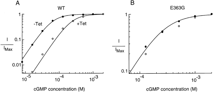 Figure 2. Tetracaine shifted the cGMP dose– response curve to the right in wild-type but not E363G channels. (A and B) cGMP dose–response curves in the absence and presence of 10 μM tetracaine for a patch containing wild-type (A) or E363G (B) channels. Currents in the absence of tetracaine are normalized to currents obtained in the presence of saturating (2 mM) cGMP. For comparison, currents in the presence of 10 μM tetracaine are normalized to currents obtained in the presence of saturating (2 mM) cGMP + 10 μM tetracaine. All currents were measured at +60 mV. Fits are to Eq. 1. For the wild-type rod channel in the absence of tetracaine: K1/2cGMP = 60.5 μM, n = 2.0. For the wild-type rod channel in the presence of 10 μM tetracaine, K1/2cGMP = 228 μM, n = 2.0. For the rod E363G channel both in the presence and absence of tetracaine, K1/2cGMP = 251 μM, n = 1.7.