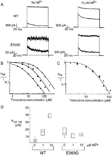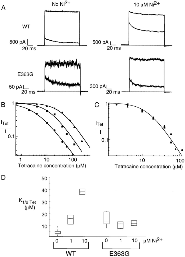 Figure 4. The E363G mutation eliminated Ni2+ relief of tetracaine block. (A) Block of wild-type and E363G channels in the absence and presence of Ni2+. Currents are in response to a voltage step to +60 mV from a holding potential of 0 mV for four separate patches. In each panel, the top trace shows current in the absence of tetracaine and the bottom trace shows current in the presence of 40 μM tetracaine. The shaded line represents the zero current level. (B) Dose–response curves for tetracaine from three separate patches containing wild-type rod channels in the presence of 0 (•), 1 (▪), and 10 (▴) μM Ni2+. All currents were measured at +60 mV. All currents were recorded in the presence of saturating (2 mM) cGMP and normalized by currents recorded in the absence of tetracaine. Fits are to Eq. 2. For 0 μM Ni2+: K1/2Tet = 3.4 μM, n = 1.0; for 1 μM Ni2+: K1/2Tet = 13.3 μM, n = 1.1; and for 10 μM Ni2+: K1/2Tet = 37.7 μM, n = 1.0. (C) Dose–response curves for tetracaine for three separate patches recorded from E363G channels in the presence of 0 (•), 1 (▪), and 10 (▴) μM Ni2+. The fit is to Eq. 2 with K1/2Tet = 15.19 μM, n = 1.6. (D) Box plots showing range of tetracaine apparent affinities for wild-type and E363G channels in 0, 1, and 10 μM Ni2+. The line in the middle of the boxes shows the median. The top and bottom edges of the boxes show the 25th and 75th percentiles of the data. The whiskers coming out of some of the boxes show the 5th and 95th percentiles. Circles represent outliers.