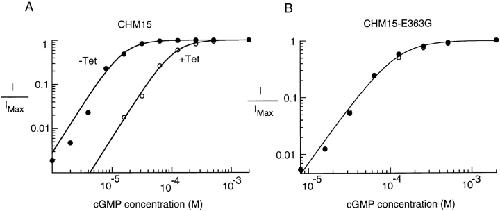 Figure 5. Tetracaine shifted the cGMP dose–response curve to the right in CHM15 but not CHM15-E363G channels. (A and B) cGMP dose–response curves in the absence and presence of 40 μM tetracaine for a patch containing CHM15 (A) or CHM15-E363G (B) channels. Currents in the absence of tetracaine are normalized by currents obtained in the presence of saturating (2 mM) cGMP. For comparison, currents in the presence of 40 μM tetracaine are normalized by currents obtained in the presence of saturating (2 mM) cGMP + 40 μM tetracaine. All currents were measured at +60 mV. Fits are to Eq. 1. For the CHM15 channel in the absence of tetracaine, K1/2cGMP = 15.6 μM, n = 2.1. For the CHM15 channel in the presence of 40 μM tetracaine, K1/2cGMP = 108.7 μM, n = 2.1. And for the CHM15-E363G channel both in the presence and absence of tetracaine, K1/2cGMP = 117.0 μM, n = 2.0.
