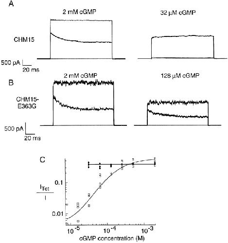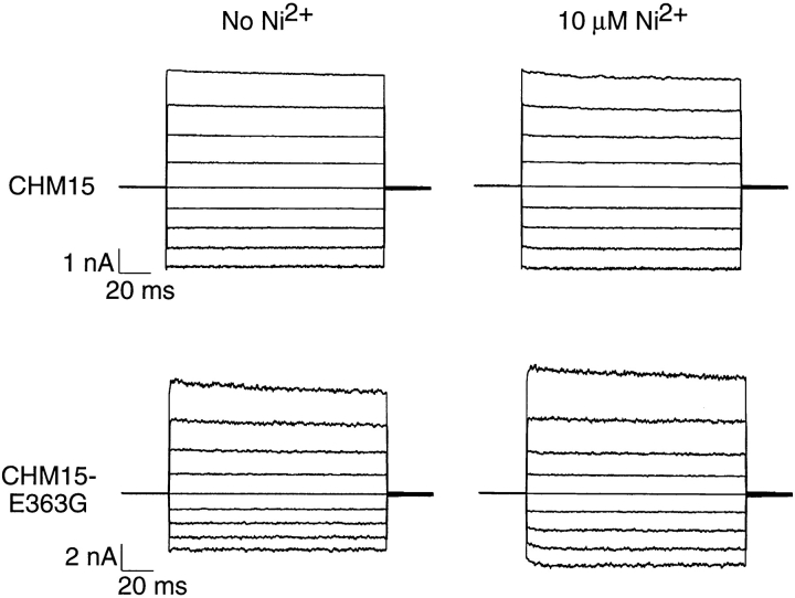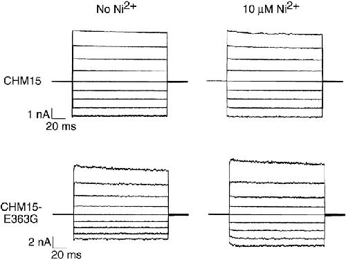 Figure 7. The effects of Ni2+ on CHM15 and CHM15-E363G. Currents are in response to families of voltage steps from a holding potential of 0 to between −80 and +80 mV in increments of +20 mV. Leak currents in the absence of cGMP have been subtracted.