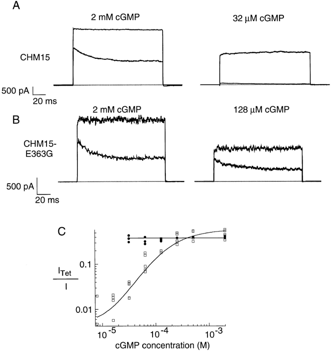 Figure 6. Tetracaine becomes more effective at low concentrations of cGMP for CHM15 but not for CHM15-E363G channels. (A and B) Comparison of the effect of 40 μM tetracaine on CHM15 (A) and CHM15-E363G (B) channels. Currents are in response to a voltage step to +60 mV from a holding potential of 0 mV. The currents recorded in the absence of tetracaine (top traces) are superimposed with the currents recorded in the presence of 40 μM tetracaine (bottom traces). Shaded lines show the zero current level. Leak current in the absence of cGMP has been subtracted from all traces. (C) The effect of 40 μM tetracaine at different concentrations of cGMP for CHM15 (□, n = 5) or CHM15-E363G (•, n = 4) channels. Data were pooled from a number of different patches. On the y-axis is the current, recorded with 40 μM tetracaine normalized by the current recorded in the absence of tetracaine at the concentration of cGMP indicated on the x-axis. All currents were measured at +60 mV. Fits to the data are from Scheme 1, with K = 4,500 M−1, L = 300, KDc = 200 nM, KDo = 200 μM for CHM15 channels and KDc = KDo = 25 μM (i.e., no state dependence of tetracaine block) for CHM15-E363G channels.