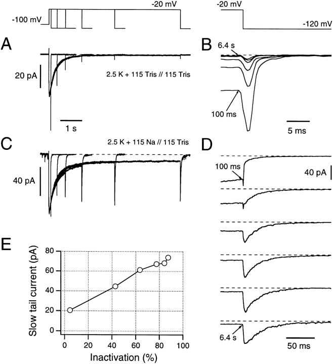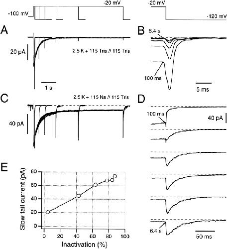 Figure 3. Dependence of inward tail current waveforms on the development of C-type inactivation, without (A and B) and with (C and D) addition of external Na+ ions. Inward currents were measured in the absence of intracellular permeating ions (Tris-EGTA in the bath), during pulses to −20 mV in external 2.5 mM K+ plus 115 mM Tris (A and B) or in NFR containing 2.5 mM K+ plus 115 mM Na+ (C and D). In these solutions, channels inactivate with a time constant of ∼1 s. In the absence of Na+ (A), the tail currents upon repolarization to −120 mV are rapid and decrease in magnitude as the degree of inactivation increases (see B). In the presence of external Na+ (C), however, tail currents are only rapid after very brief depolarizations. After longer depolarizations (i.e., as C-type inactivation occurs), tail currents slow down and do not decrease in size. D shows the tail current sections of C, aligned in time to the end of the test depolarization. Note the 10-fold change in time scale compared with B. E shows an analysis of data from C and D, demonstrating a linear relationship between the fraction of channels that have entered into C-type inactivation and the peak magnitude of the slow component of Na+ tail currents.