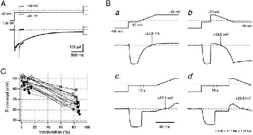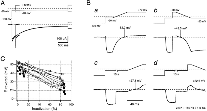 Figure 4. Shaker channels become less permeable to K+ ions and relatively more permeable to Na+ ions when C-type inactivated. (A) Superposition of four current traces recorded in NFR versus Na-EGTA; i.e., in symmetrical 115 mM Na+ but with 2.5 mM K+ added to the external solution. Pairs of traces were recorded with a depolarization to −20 mV for 200 ms and 3 s leading to quite different degrees of inactivation at the end of the depolarization. Subsequently, the potential was stepped to either −40 or +40 mV. After the short depolarization, the subsequent step to +40 mV shows only marginal outward current, the same step after almost complete inactivation results in outward currents that are ∼50% of the size of the inward currents obtained at −40 mV, indicating an enhanced relative Na+ permeation after development of C-type inactivation. (B) Demonstration of the protocol used for collection of instantaneous I-V data at two different durations within a −20-mV test depolarization. Ramp potential changes of 40-ms duration were imposed after 20-ms (B, a and b) and 10.04-s (B, c and d) test pulses. Ramps were upward (from −20 to +70 mV) in B, a and c, and downward (from +70 to −20 mV) in B, b and d. See text for further description of this protocol. (C) Reversal potentials obtained from instantaneous I-V data are plotted as functions of the degree of C-type inactivation that had occurred before starting the ramps. Results are shown for eight patches from which full data sets were collected. Straight lines connect data points from the same patch. Upward ramp data points are shown by open symbols and connected by solid lines, downward ramp points are shown by filled symbols and connected by dashed lines.