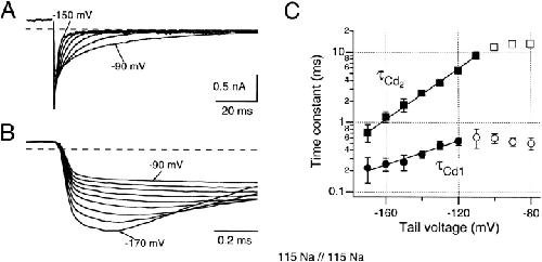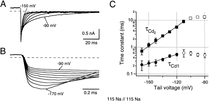 Figure 6. Deactivation of C-type inactivated channels. (A and B) Tail currents were recorded after depolarizations to +20 mV for 100 ms at tail potentials between −170 and −80 mV using 10-mV steps. Representative traces are shown in A and B using different time scales to demonstrate the voltage sensitivity of deactivation in A and of the hooked rising phase in B. The recording bandwidth was 4 kHz. The time constants of both, the hooks (τCd1) and the deactivation (τCd2), were estimated by fitting double-exponential functions to the data. The mean time constants resulting from six experiments are plotted in C as a function of the tail potential. The filled symbols indicate those data points that were considered for the determination of the slopes (straight lines) that yielded a voltage dependence for both processes corresponding to effective gating valences of 0.51 (τCd1) and 1.05 e0 (τCd2).