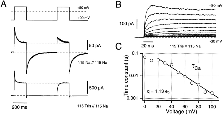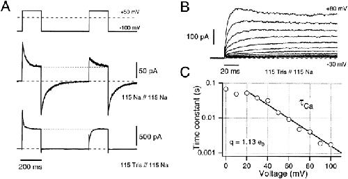 Figure 7. Activation of ionic current through C-type inactivated channels. Recovery from C-type inactivation is affected by external cations (A). Double-pulse experiments were performed in the indicated solutions. The duration of the interpulse interval at −100 mV was chosen such that the slow tail currents in Na/Na solutions reach the baseline. In Na/Na solutions (top) depolarization after complete tail current deactivation shows only partial recovery from inactivation. In Tris/Na solutions (bottom), no significant recovery from inactivation is visible. Instead, slow, mono-exponential reactivation to the same steady state level as in the first pulse is observed (dashed lines). (B) Activation of current through C-type inactivated channels is shown in Tris/Na solutions in response to depolarizations from −100 mV to voltages between −30 and +80 mV in steps of 10 mV. The depolarizations were given in rapid succession such that no marked recovery from inactivation occurred (see A). The activation kinetics (under these conditions of steady state inactivation) were estimated by fitting single-exponentials functions to the data. The resulting time constants are plotted in C as a function of the test potential. The straight line corresponds to a single exponential function in this semilogarithmic plot. The slope of this line yields an estimate for the apparent gating charge associated with the process of reactivation of 1.13 e0.