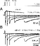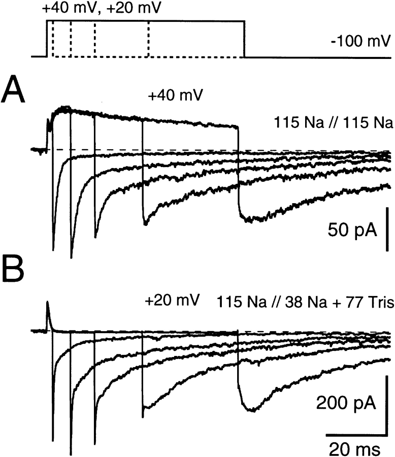 Figure 2. Tail current kinetics change as C-type inactivation develops (A and B). (A) Recordings obtained in symmetric (115 mM) Na+ solutions, using test pulses (to +40 mV) of differing durations demonstrate that development of C-type inactivation parallels significant changes in tail current waveform. After short depolarizations, they are dominated by a rapid component associated with deactivation of noninactivated channels, followed by a small slow ionic component. This slow ionic current component increases with increasing depolarization duration. Finally, a rising phase (hook) in the onset of the slow ionic current becomes apparent while the initial, fast peak disappears as C-type inactivation approaches steady state. (B) Recordings obtained under ionic conditions where the estimated reversal potential for Na+ (115 mM versus 38 mM) nearly matches the potential of depolarization (+20 mV) such that IgON becomes clearly visible. Upon increasing duration of the depolarizing pulse segment, the tail currents undergo kinetic changes similar to those seen in A. Data traces were low pass filtered at 4 kHz.