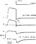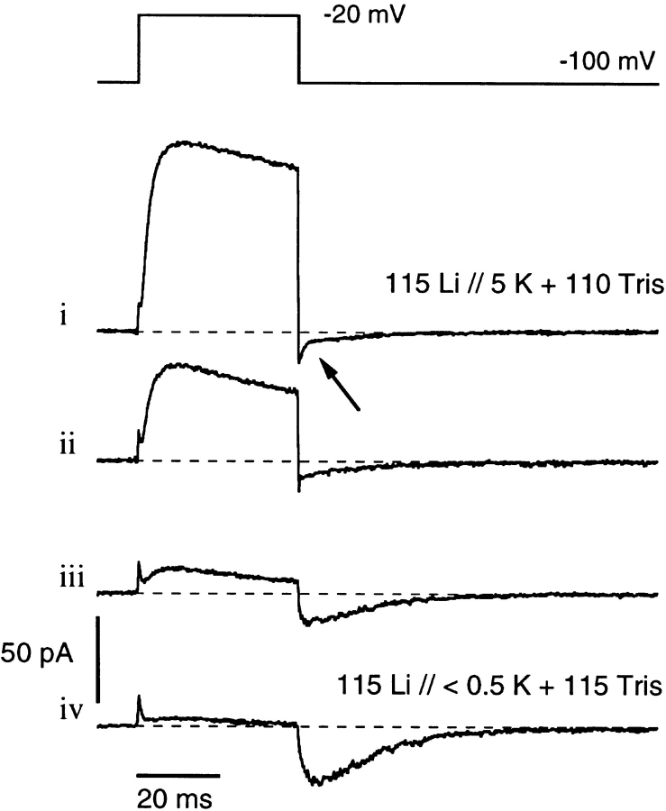 Figure 5. Influence of intracellular K+ on the tail currents. The first trace (i) was recorded with external Li-Ringer (same results would be obtained with Na+ instead of Li+ as permeating ion, not shown) and an internal solution containing 5 mM K+ plus 110 mM Tris+. The arrow points to an inflection in the tail currents indicating two components. The following traces (ii–iv) were recorded while the internal K+ ions were slowly washed out by Tris-EGTA solution. As the outward currents disappear, due to removal of internal K+ ions, the tail currents become slower and larger, indicating increased Li+ permeation.