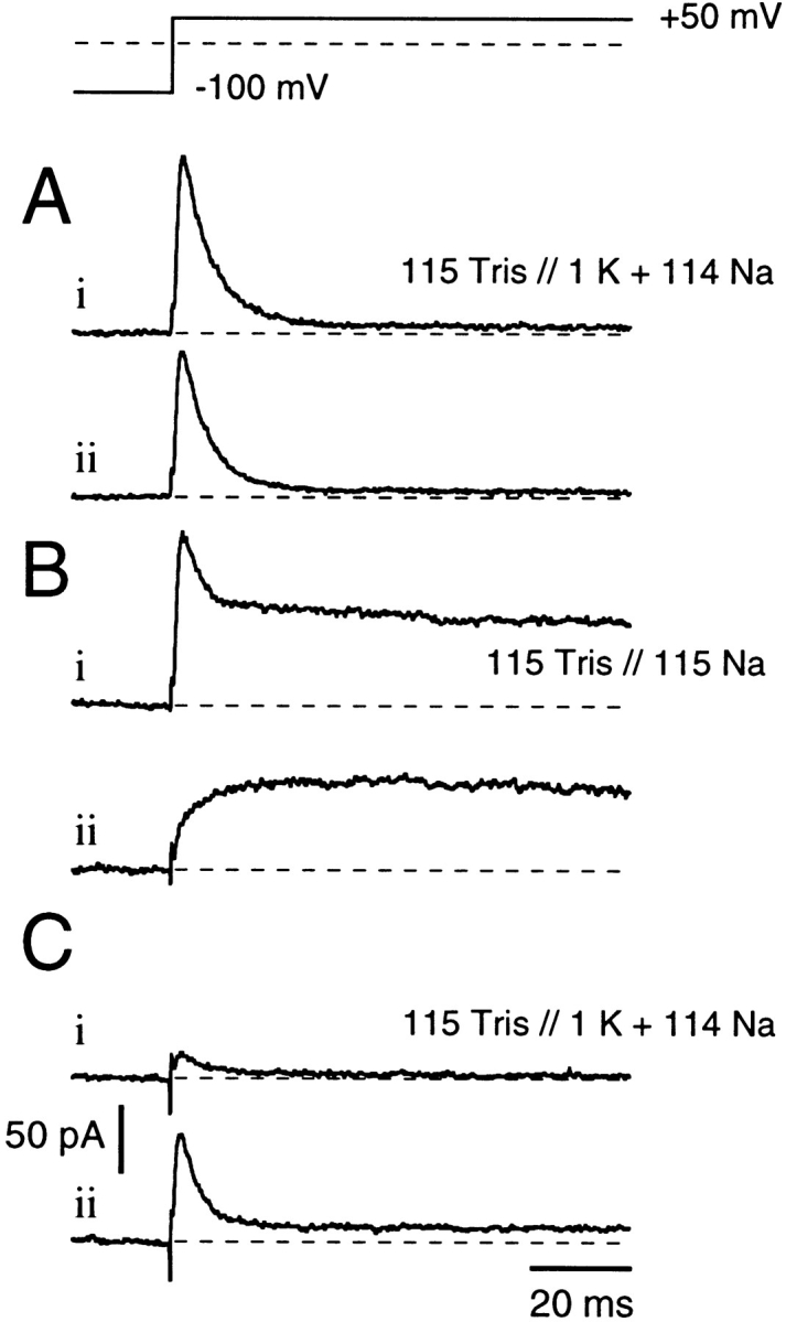 Figure 8. Effects of internal K+ ions on recovery from C-type inactivation. Currents were recorded in the absence of extracellular permeating ions (Tris-Ringer), individual traces being separated by 15-s intervals. Between A, B, and C, bath solutions were altered as indicated. In A, in the presence of 1 mM internal K+, channels undergo rapid and complete inactivation (A, i and ii). Switching to K+-free 115 mM internal Na+ solutions results in a similarly fast inactivation (B, i) that falls to a steady state value that indicates continued Na+ permeation through C-type inactivated channels (see also Fig. 7 A). The next pulse in Na+-solution (B, ii) shows no recovery from inactivation, thus this trace shows only activation of C-type inactivated channels (as in Fig. 7 B). Switching back to K+-containing internal solutions reveals almost complete inactivation (C, i). However, the final pulse (C, ii) shows partial recovery of “normal” inactivation.