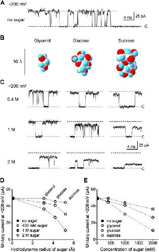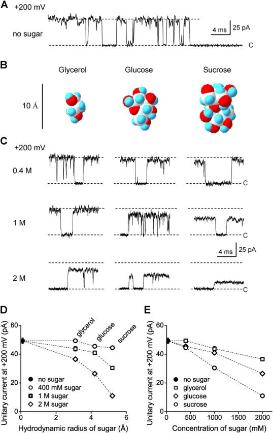 Figure 1. Intracellular sugars decrease outward unitary currents through WT BK channels. (A) Representative outward single-channel currents recorded at +200 mV with no sugar in the intracellular solutions. Closed channel current level is indicated by C. Symmetrical 150 mM KCl and effective low pass filtering of 4 kHz in A and C. (B) Structures of the three sugar molecules used in this study shown as space filling surfaces. The images were obtained with Swiss Protein Viewer using atomic coordinates. The atomic coordinates for glycerol were from ChemFinder structural databases (http://chemfinder.cambridgesoft.com/), and for glucose and sucrose from the library of molecular structures at New York University (http://www.nyu.edu/pages/mathmol/library/library.html). The atoms are identified as: oxygen, red; carbon, white; and hydrogen, cyan. Scaling for the figure was based on dimensions determined from CPK models of the sugars (Harvard Apparatus). (C) Representative outward single-channel currents recorded at +200 mV with sugars in the intracellular solutions at the indicated concentrations. The type of sugar present in the solution for each column of currents in C is shown above the current records in B. (D) Plots of unitary current amplitudes at +200 mV versus the hydrodynamic radii of the different sugars over a range of concentrations, as indicated. The hydrodynamic radii were 3.1 Å, 4.2 Å, and 5.2 Å for glycerol, glucose, and sucrose, respectively, as determined by viscometry (Schultz and Solomon, 1961). (E) Plots of the unitary current amplitudes at +200 mV versus sugar concentration for the indicated sugars. The filled circles in D and E correspond to the unitary current amplitude at +200 mV in the absence of sugar.