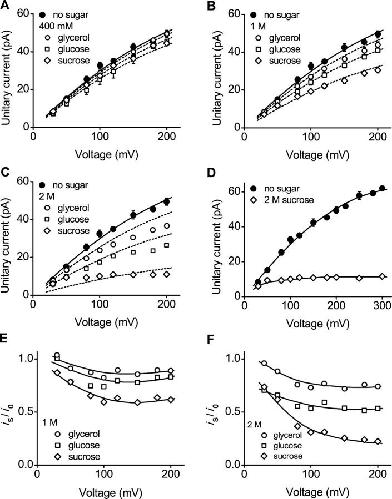 Figure 2. Intracellular sugar decreases outward unitary currents through WT BK channels in a size- and concentration-dependent manner over the examined range of voltages. (A–D) Plots of outward unitary current amplitudes versus voltage without and with the indicated sugar. The continuous lines are polynomial fits to the unitary currents in the absence of sugar, whereas the dashed lines for each sugar are empirical predictions obtained by scaling the continuous lines by a single value obtained from Eq. 5, as listed in Table I in the predicted column. Symmetrical 150 mM KCl. (D) Unitary current amplitudes saturate with 2 M sucrose at voltages >+100 mV with 150 mM K+i. (E and F) Outward currents drive sugar into the vestibule, decreasing the currents. Plots of the ratios of the outward unitary currents in the presence and absence of 1 M (E) and 2 M (F) sugar. The lines in D–F have no theoretical meaning.