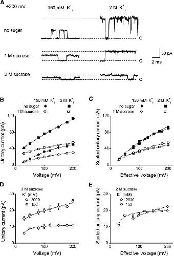 Figure 3. Outward unitary currents are diffusion limited for WT BK channels with 2 M intracellular sucrose and 150 mM K+i. (A) Representative outward unitary currents recorded at +200 mV from WT BK channels without and with 1 and 2 M sucrose, for 150 mM and 2 M K+i. Effective filtering: 4 kHz. (B) Plots of outward unitary current amplitude versus voltage without and with 1 M sucrose at the indicated K+i. (C) Currents with 1 M sucrose and 150 mM K+i are not diffusion limited. The data in B are replotted after shifting the 2 M K+i data to the right by 50 mV to correct for the shift in reversal potential and scaling the data by 1.8. The data points with 2 M K+i for shifted voltages >200 mV are not shown. (D and E) Increasing K+i removes the saturation of outward current at high voltage with 2 M sucrose, consistent with diffusion-limited currents in 2 M sucrose with 150 mM K+i. The unitary currents with 2 M sucrose and with 150 mM K+i or 2 M K+i are plotted in D. The data in D are then replotted in E after shifting and scaling the data in the same manner as for C. The lines in B–D have no theoretical meaning.