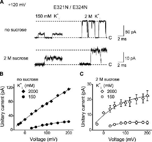 Figure 4. Outward unitary currents with 2 M intracellular sucrose and 150 mM K+i are diffusion limited for mutant BK channels without the ring of negative charge. (A) Representative outward single-channel currents recorded at +120 mV from E321N/E324 mutant channels with the indicated K+i in the absence and presence of 2 M sucrose. Effective filtering: 4 kHz. (B and C) Plots of outward unitary current amplitudes versus voltage for E321N/E324N mutant channels in the absence (B) and presence (C) of 2 M sucrose at the indicated K+i. High K+i removes the saturation observed with 2 M sucrose. The lines in B and C have no theoretical meaning.