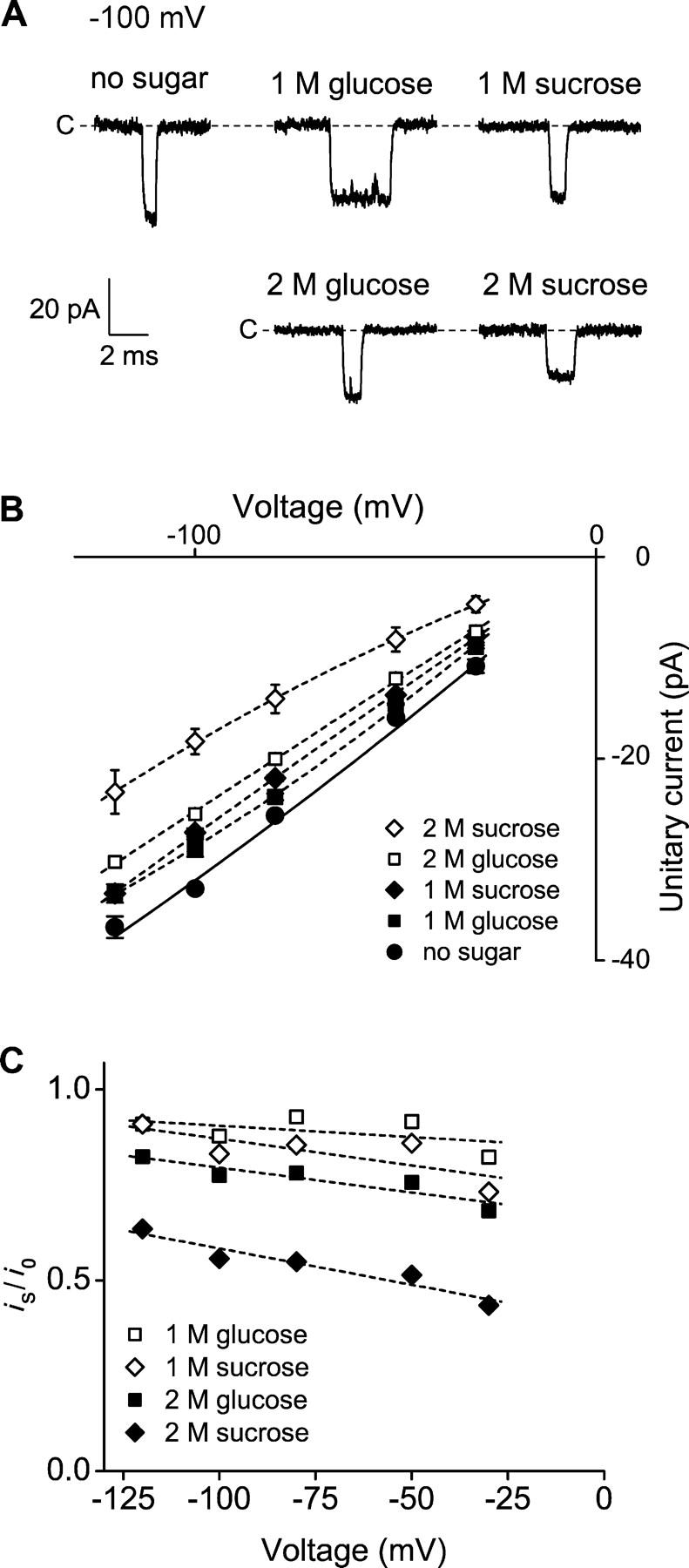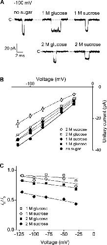 Figure 5. Sugars differentially decrease inward and outward unitary currents in WT BK channels. (A) Representative inward single-channel currents recorded at −100 mV from WT BK channels with and without the indicated sugars. Effective filtering: 4 kHz. (B) Plots of inward unitary current amplitudes versus voltage with and without the indicated sugars. (C) Inward currents drive sugar out of the vestibule. Plots of the ratios of the inward unitary currents in the presence of the indicated sugars (is) to the inward unitary currents in the absence of sugars (i0) versus voltage. Symmetrical 150 mM K+i. The lines in B and C have no theoretical meaning.