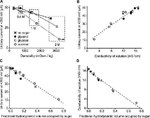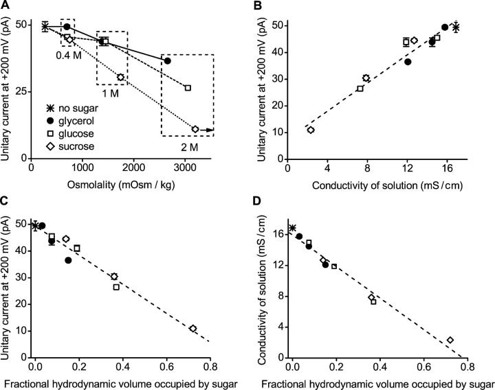 Figure 6. The reduction of outward unitary currents in WT BK channels is strongly correlated with sugar-induced changes in diffusion coefficient, conductivity, and fractional hydrodynamic volume occupied by the sugar, but not osmolality. (A–C) Plots of the outward unitary current at +200 mV versus osmolality (A), conductivity (B), and fractional hydrodynamic volume of the solution occupied by sugar (C). The arrow in A indicates that the osmolality of the solution with 2 M sucrose was greater than the plotted maximum value that the osmometer could read. (D) Plot of conductivity versus fractional hydrodynamic volume. Dashed lines in B, C, and D are linear regression fits to the all the plotted points, with correlation coefficients, R, of 0.97, −0.98, and −0.99 respectively. For B, C, and D, the data for each sugar are presented for concentrations of 0.4, 1, and 2 M. As the concentration of each sugar increases, the conductivity of the solution decreases and the fractional hydrodynamic volume occupied by each sugar increases.
