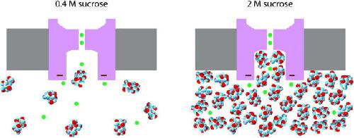 Figure 7. Cartoon of a BK channel with 150 mM K+ and 0.4 and 2 M sucrose. The inner vestibule is drawn with a depth of 20 Å and a diameter of 18.5 Å. The actual physical dimensions and shape are likely to be different. The number of ions visible is the average number that would be contained in an 8-Å slice in the plane of the figure centered on the centerline of the channel. It is assumed that the concentration of sucrose in the channel is the same as in the bulk intracellular solution. The negative charge at the entrance to the inner vestibule attracts additional K+ ions (Brelidze et al., 2003). The selectivity filter is drawn with two K+ ions (Morais-Cabral et al., 2001), and the pore helices are likely to provide a favorable electrostatic environment for a K+ ion in the vestibule (Roux and MacKinnon, 1999).