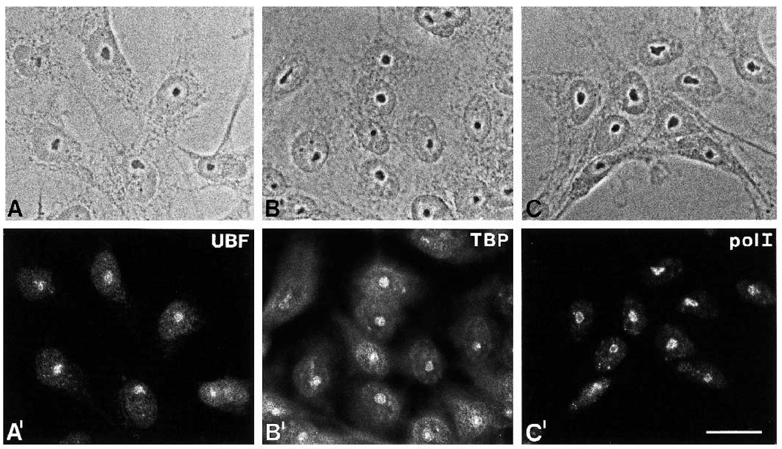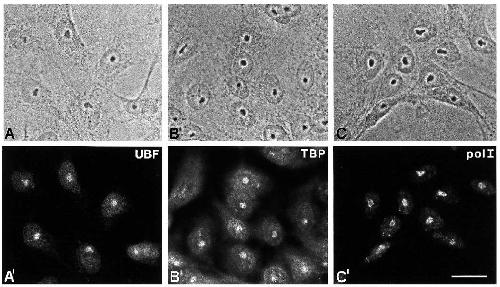 Fig. 1. Immunofluorescence microscopy of Xenopus XTC-2 cells with antibodies directed against xUBF (A¢), xTBP (B¢) and pol I (C¢). All