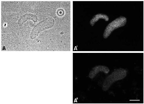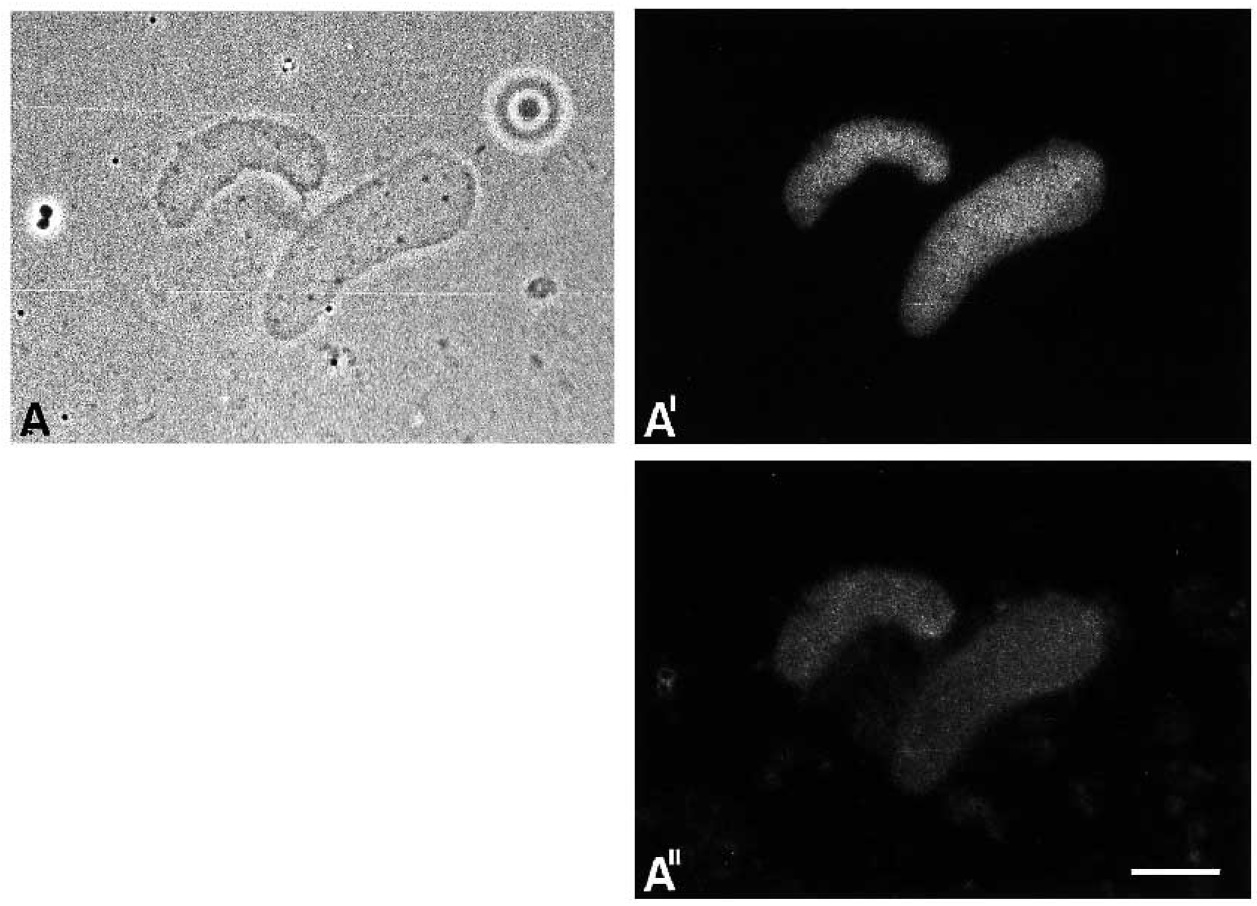 procedures label the same dot-like structure. The corresponding Hoechst fluorescence is shown in A¢¢. The slightly different contours of the