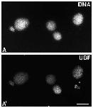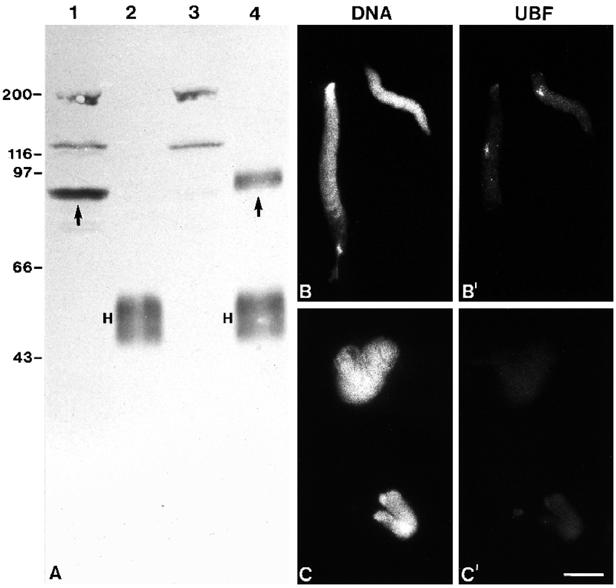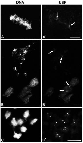 (B¢). Nuclei assembled in UBF-deficient extract are completely negative with UBF antibodies (C¢). The corresponding Hoechst fluorescence is