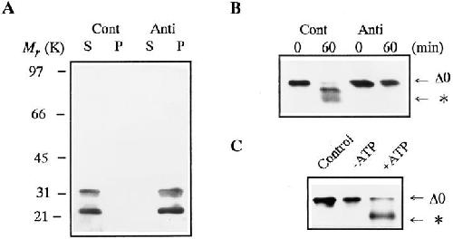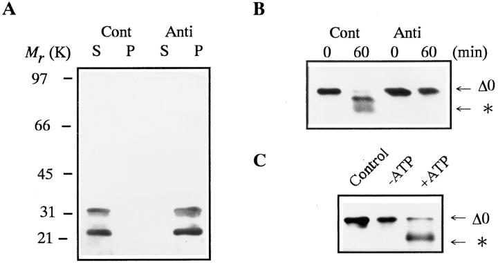 Figure 2. Inhibition of cyclin B digestion by proteasome or ATP depletion. Cyclin B was detected by the B63 antibody. The position to which the digested cyclin B migrated is indicated by an asterisk. (A) Immunodepletion of 26S proteasome from purified 26S proteasome fraction. 26S Proteasome was immunoprecipitated by affinity-purified anti-proteasome IgG (Anti) or control IgG (Cont), as described (Tokumoto and Ishikawa, 1993). Supernatants (S) and precipitates (P) were immunoblotted with a mixture of three monoclonal antibodies against goldfish 20S proteasome (GC4/5, 3α and 3β; Tokumoto et al., 1995a). (B) Digestion of cyclin B in the mock- (Cont) or proteasome-depleted (Anti) 26S proteasome fraction. Cyclin Δ0 (5 μg/ml) was incubated at room temperature with the supernatant after immunoprecipitation with control or anti-proteasome IgG. Samples were exposed to Laemmli's SDS sample buffer at the indicated times during incubation. (C) Effect of ATP depletion on cyclin B digestion by the 26S proteasome. Cyclin Δ0 (5 μg/ml) was incubated at room temperature for 60 min without (Control) or with the 26S proteasome in the presence of an ATP-depleting system (10 mM glucose and 1 μg/ml hexokinase, −ATP) or 2 mM ATP (+ATP).