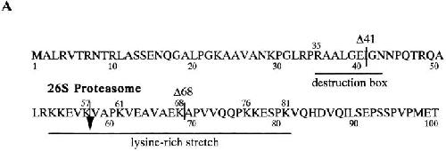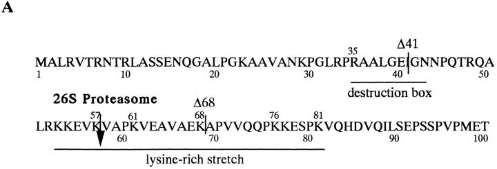 Figure 3. NH2-terminal sequence of goldfish cyclin B and digestion of recombinant cyclin B by the 26 S proteasome. (A) Amino acid sequence of the NH2-terminal region of goldfish cyclin B. The site digested by the 26S proteasome (COOH terminus of K57) and truncated sites of deletion mutants (Δ41, Δ68) are indicated. The destruction box and lysine-rich stretch are also indicated. (B) Digestion of full length and truncated cyclin Bs by the 26S proteasome. Cyclins Δ0, Δ41, and Δ68 were incubated in the absence (−) or presence (+) of the 26S proteasome for 120 min at room temperature. Cyclin degradation was assessed by immunoblotting against two kinds of anti- cyclin B (B63 and B112) monoclonal antibodies. B112 recognizes the NH2-terminal portion of goldfish cyclin B. The position of the digested cyclin B is indicated by an asterisk.