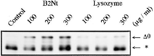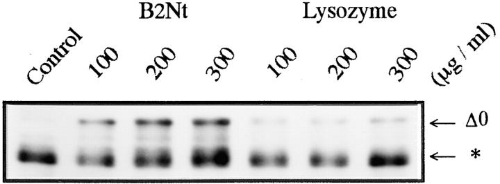 Figure 4. Inhibition of 26S proteasome-catalyzed cyclin B digestion in vitro by the NH2-terminal fragment of Xenopus cyclin B2 (B2Nt). Cyclin Δ0 was incubated with purified 26S proteasome (60 μg/ml) for 120 min in the absence (Control) or presence of various concentrations of B2Nt or lysozyme. Cyclin B was detected with the B63 antibody. The migrating position of the digested cyclin B is indicated by an asterisk.