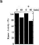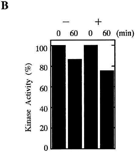 Figure 5. Digestion of native cyclin B by 26S proteasome. The truncated cyclin B produced by the 26S proteasome digestion is indicated by an asterisk. (A) Digestion of cyclin B in MPF complex by the 26S proteasome. The MPF complex in mature carp oocytes was prepared using suc1 beads (Yamashita et al., 1992b). The beads were washed with buffer (50 mM Tris-HCl, 20% glycerol, 10 mM 2-mercaptoethanol, 0.1 mM ATP, pH 7.5) and shaken in the absence (−) or presence (+) of 60 μg/ml of the 26S proteasome at room temperature with agitation. Samples were treated with SDS sample buffer at the indicated times and immunoblotted against the B63 antibody. Two cyclin bands were detected, and only the upper band was digested by the 26S proteasome. It is unlikely that these two bands correspond to different phosphorylation states of cyclin B (Yamashita et al., 1992b). In C, only a single band of cyclin B was detected when oocytes were directly exposed to SDS sample buffer. Therefore, the lower band is probably produced by undesirable proteolysis during treatment with the suc1 beads. (B) Protein kinase activity of suc1 precipitates before and after the digestion with 26S proteasome. The kinase activity of suc1 precipitates incubated for 60 min in the absence (−) or presence (+) of 26S proteasome was measured with a synthetic peptide substrate for cdc2, as described (Yamashita et al., 1992a). Activities are indicated as a percentage of the activity at 0 min for each condition. (C) Detection of a truncated cyclin B during goldfish egg activation. Ovulated eggs (2 ml) were placed in 3 ml goldfish Ringer's solution (Yamashita et al., 1992b) and immediately homogenized in 5 ml SDS sample buffer at the indicated times. Before detecting truncated cyclin B by immunoblotting with B63 or B112, proteins with a molecular mass of 40–50 kD were separated by SDS-PAGE (Prep Cell Model 491; Bio Rad, Richmond, CA) and concentrated.