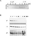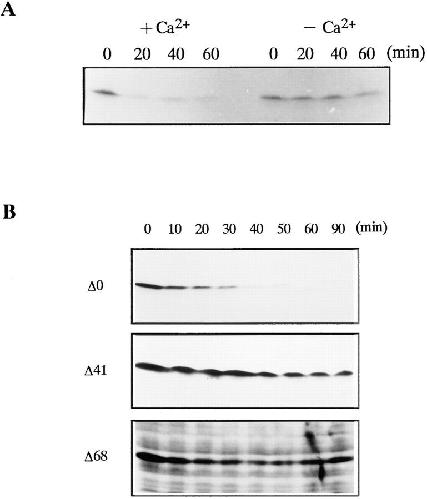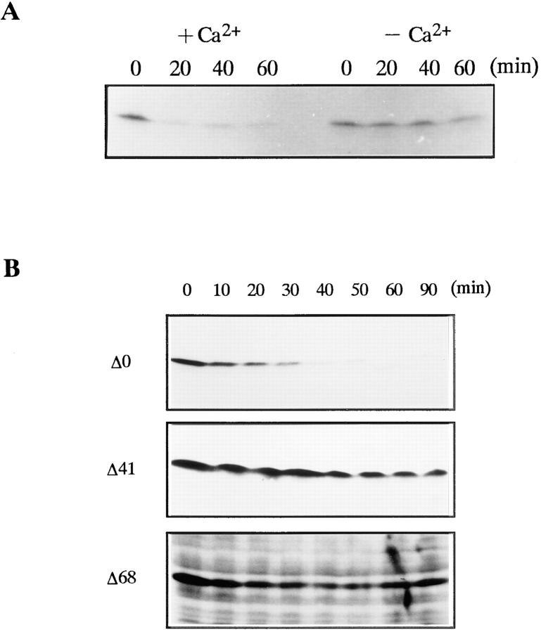 Figure 7. Degradation of goldfish cyclin B in Xenopus egg extracts. Cyclin B was detected with B63 antibody. (A) E. coli-produced goldfish cyclin Δ0 was added to Xenopus egg extract at a final concentration of 5 μg/ml. Incubations proceeded in the absence (−Ca2+) or presence (+Ca2+) of 0.4 mM CaCl2 for the indicated times. (B) E. coli-produced cyclin Δ0, Δ41, and Δ68 were added to Xenopus extracts at the final concentration of 5 μg/ml. Cyclin degradation was induced by 0.4 mM Ca2+ and terminated by adding SDS sample buffer at the indicated times.