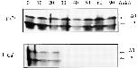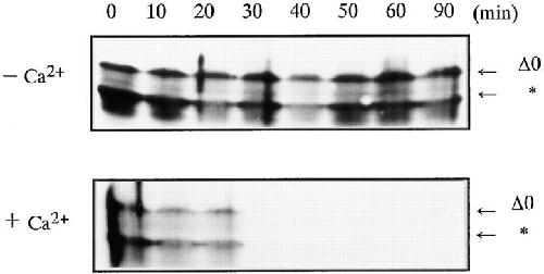 Figure 8. Degradation of intermediate cyclin B (cyclin Δ57) in Xenopus egg extracts. Cyclin Δ57 was obtained by digesting cyclin Δ0 with 26S proteasome. 1/20 vol of the digestion mixture containing cyclins Δ0 and Δ57 was added to Xenopus extracts, and cyclin degradation was examined in the absence (−Ca2+) or presence (+Ca2+) of 0.4 mM Ca2+. Samples were exposed to SDS sample buffer at the indicated times. Cyclin degradation was assessed by immunoblotting with B63 antibody. The position of cyclin Δ57 is indicated by an asterisk.