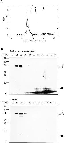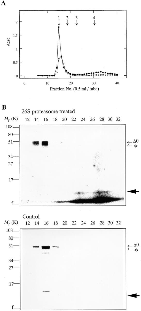 Figure 9. Separation of intermediate cyclin B and NH2-terminal fragment by gel chromatography. (A) Sephadex G-50 column chromatography. The 35S-labeled cyclin Δ0 was produced in vitro in rabbit reticulocyte lysate. Digestion of 35S-labeled cyclin Δ0 was performed for 60 min at room temperature with (•) or without (○) 26S proteasome. Samples were then separated on Sephadex G-50 column (1.0 × 19.0 cm) in 100 mM Tris-HCl, 5 mM MgCl2, pH 7.6. Fractions of 0.5 ml were collected. Arrows indicate the eluted positions of molecular weight standards as follows: 1, bovine serum albumin; 2, myoglobin; 3, ubiquitin; 4, total column volume (Vt). (B) SDS-PAGE analysis of gel chromatography fractions. Sephadex G-50 column chromatography fractions from 26S proteasome-treated cyclin Δ0 and untreated (Control) were separated by SDS-PAGE (15% gel) followed by autoradiography on Imaging plates (Fuji Film). The positions of the digested cyclin B is indicated by an asterisk, and the positions of NH2-terminal portion of cyclin B is indicated by an arrowhead.