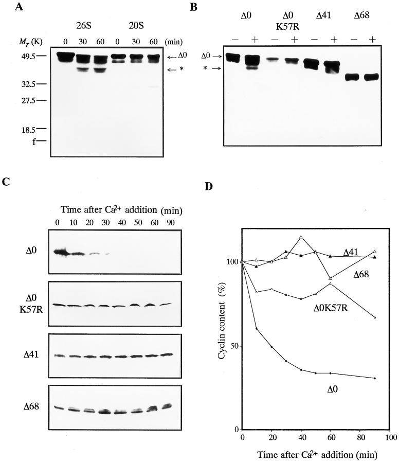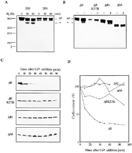 Figure 10. Digestion and degradation of in vitro translated cyclin B. The 35S- labeled cyclins Δ0, Δ0K57R, Δ41, and Δ68 were produced in vitro in rabbit reticulocyte lysate. After the translation of each cyclin, the lysate was incubated in the presence of 100 μg/ml of cycloheximide at room temperature under the indicated conditions. The 35S-labeled proteins were resolved by SDS-PAGE followed by autoradiography on Imaging plates (Fuji Film). The position of the digested cyclin B is indicated by an asterisk. (A) Digestion of full length cyclin B by purified 20S and 26S proteasomes. The reticulocyte lysate containing cyclin Δ0 was incubated with 60 μg/ml of proteasomes. (B) Digestion of full length, point mutated, and NH2-terminal truncated cyclin Bs by purified 26S proteasome. The reticulocyte lysate containing cyclin Δ0, Δ0K57R, Δ41, or Δ68 was incubated in the absence (−) or presence (+) of 60 μg/ ml of the 26S proteasome for 60 min. (C) Degradation of cyclin B in Xenopus egg extracts. One ninetieth of the lysate containing cyclin Δ0, Δ0K57R, Δ41, or Δ68 was added to the Xenopus egg extracts, and its degradation was induced by 0.4 mM Ca2+. At the indicated times, the reaction was terminated by adding SDS sample buffer. (D) The same sample as in C. Cyclin contents were quantified using an image analyzer (BAS2000; Fuji Film).
